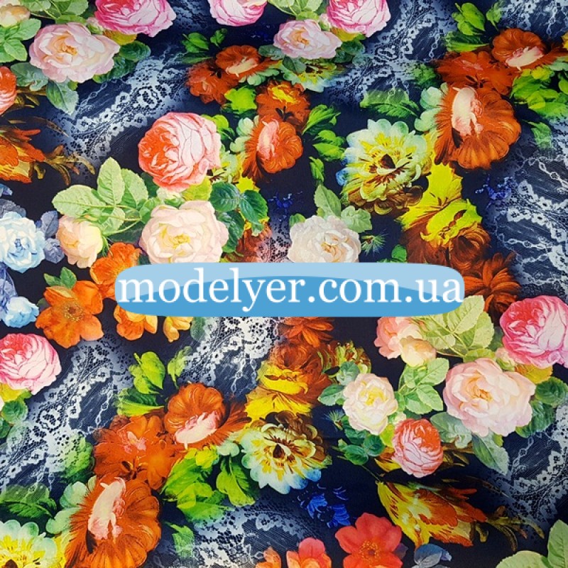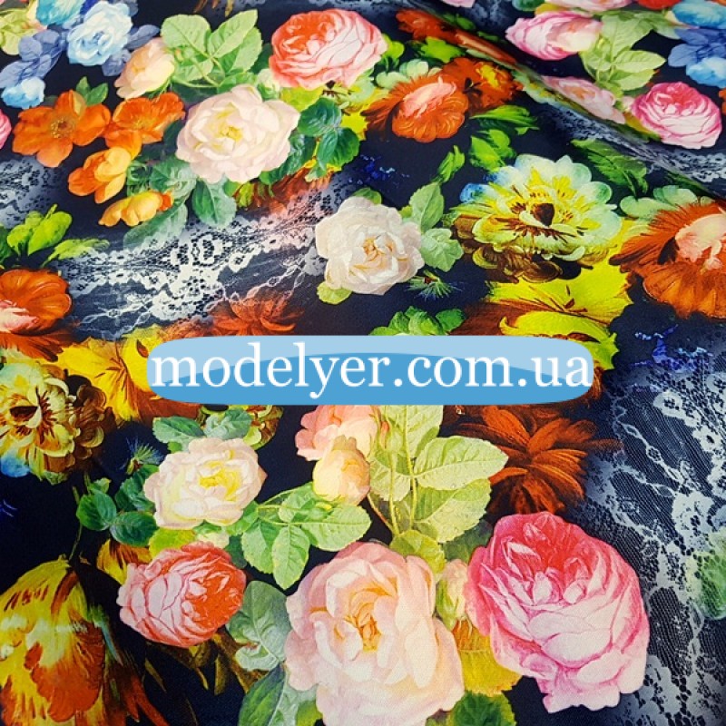 Ткань Дайвинг принт Цветы на темно-синем фоне - это смесь полиэстера, лайкры и вискозы, обладающая свойствами, позволяющими шить из нее большой ассортимент спортивной и повседневной одежды. Ткань дайвинг используется в основном для пошива спортивных изделий, так как ткань дайвинг приятен на ощупь, эластичен и прекрасно сохраняет форму.
